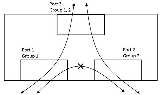 vlan-multiple-useで機能を有効にした後、vlan-multipleでポートが所属するグループ番号を指定します。1つのポートを複数のグループに所属させることができます。あるポートで受信したパケットは、当該ポートと同じグループ番号に所属する他のポートから送信されます。