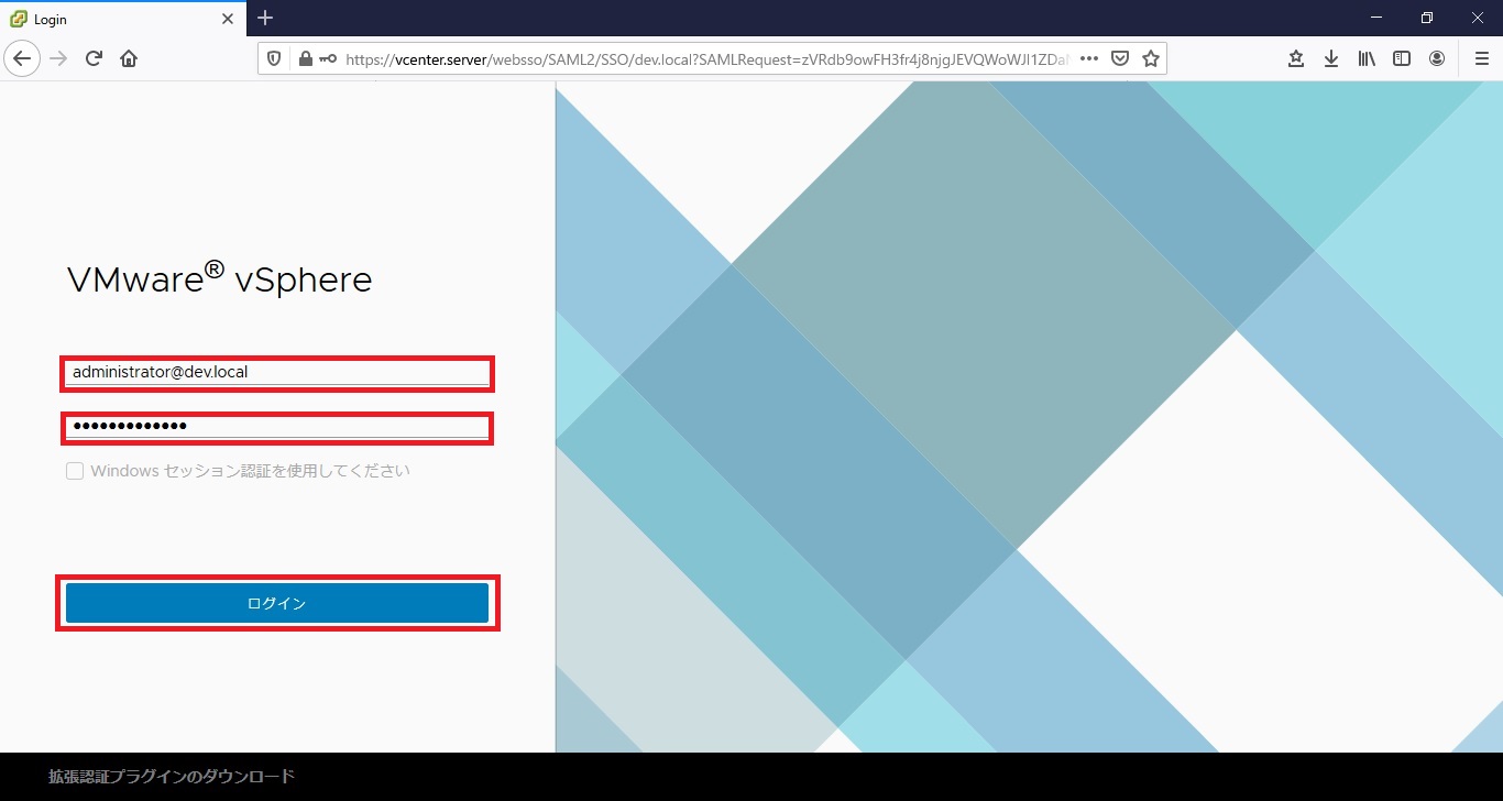 実際は接続先の vCenter Server に対して権限があるユーザーの認証情報をご使用ください。