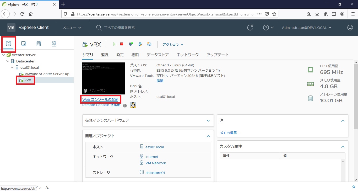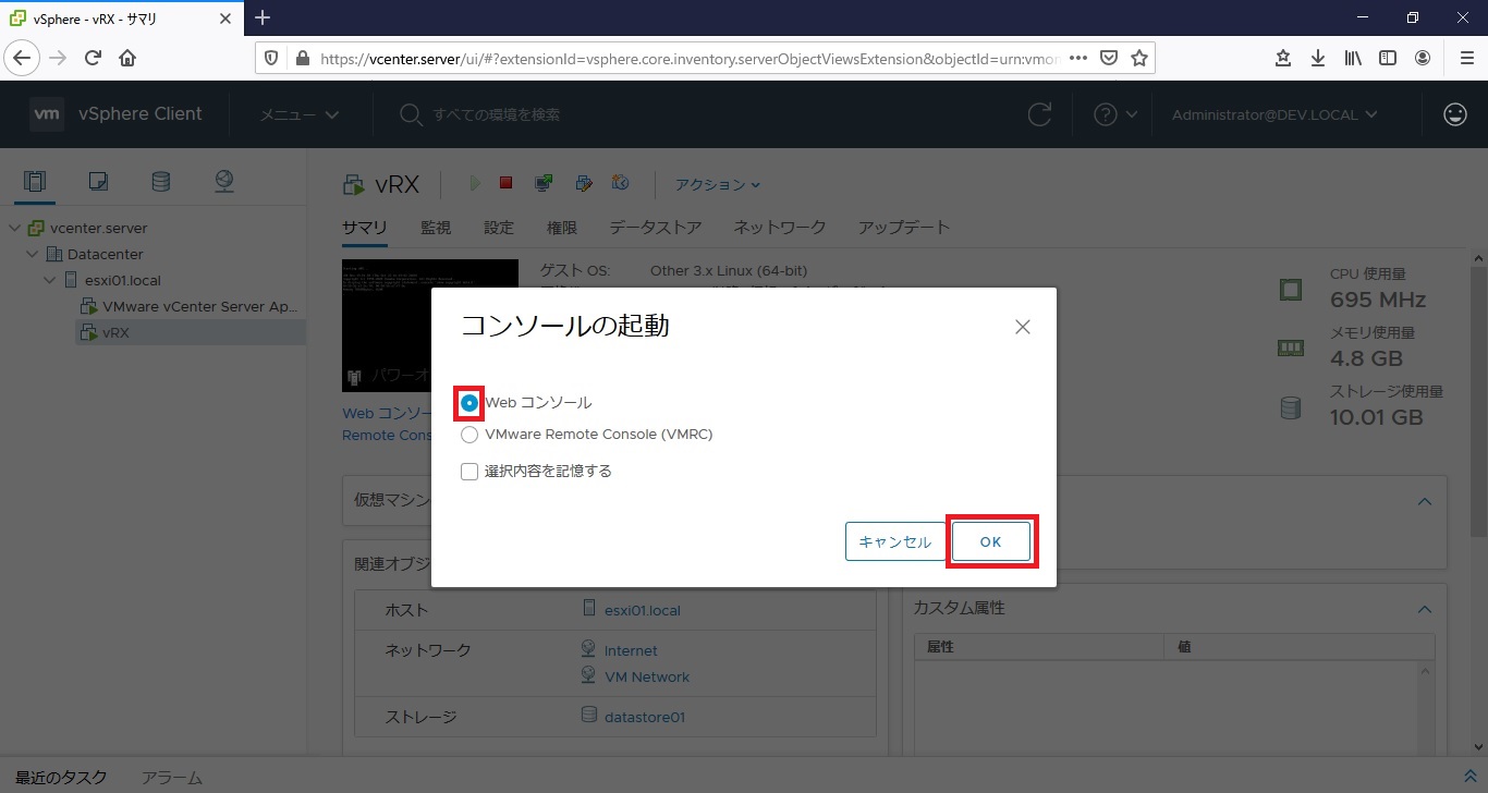 「ホストおよびクラスタ」画面からデプロイ済みの vRX を選択し、「Web コンソールの起動」を選択します。