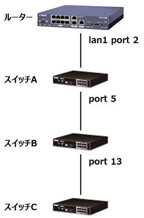 上図のような構成でスイッチ C を指定する場合の表記は "lan1:2-5-13" となります。
