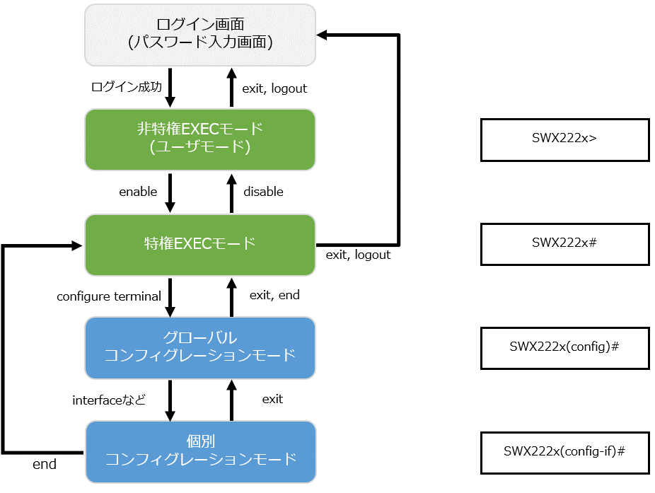 SWX222xの設定変更や状態参照をする場合、適切なコマンド入力モードに遷移してから、コマンドを実行する必要があります。コマンドの入力モードは以下のような階層に分かれており、各々のモードで入力できるコマンドが異なります。ユーザーは、プロンプトを確認することで、現在、どのモードにいるのか確認することができます。