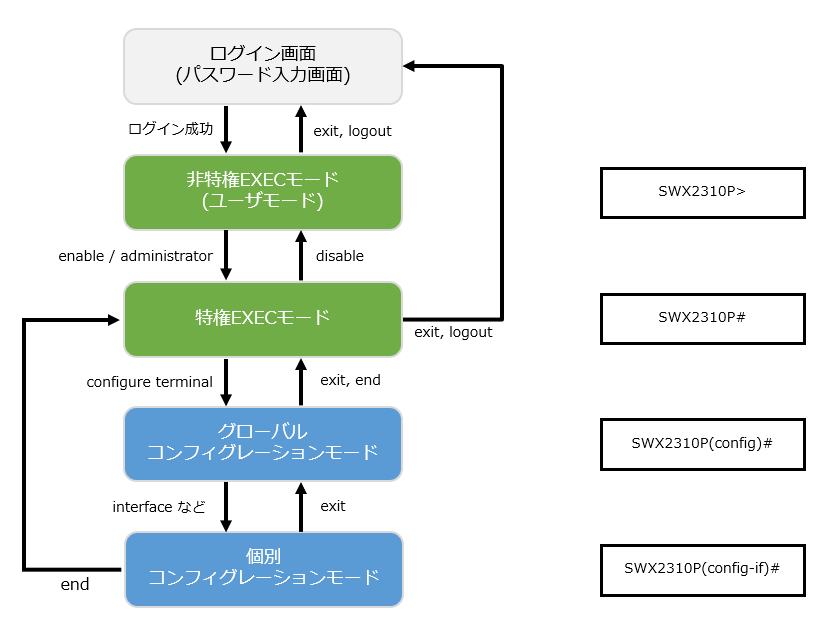 SWX2310Pの設定変更や状態参照をする場合、適切なコマンド入力モードに遷移してから、コマンドを実行する必要があります。コマンドの入力モードは以下のような階層に分かれており、各々のモードで入力できるコマンドが異なります。ユーザーは、プロンプトを確認することで、現在、どのモードにいるのか確認することができます。