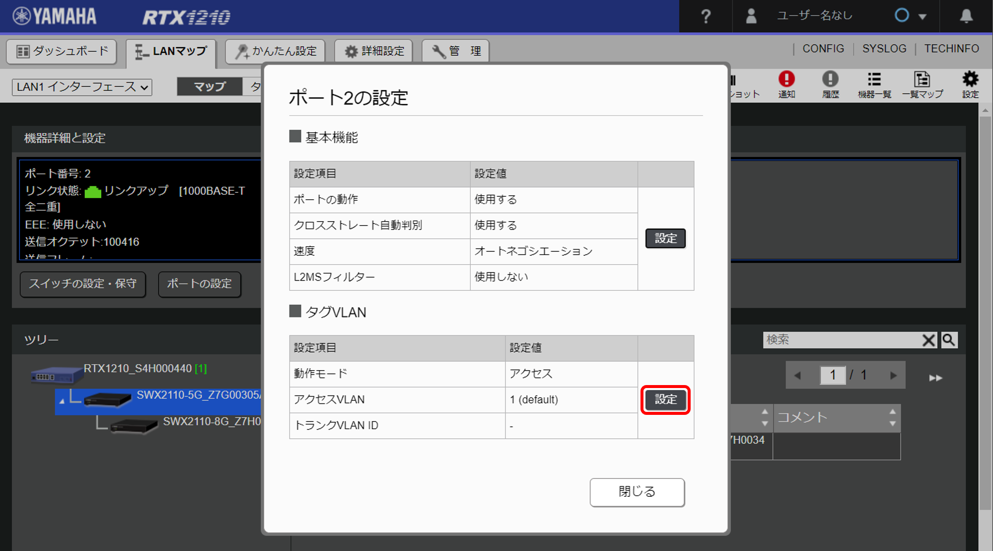 - 「ポートの設定」ダイアログで、「タグVLAN」の [設定] ボタンをクリックします。