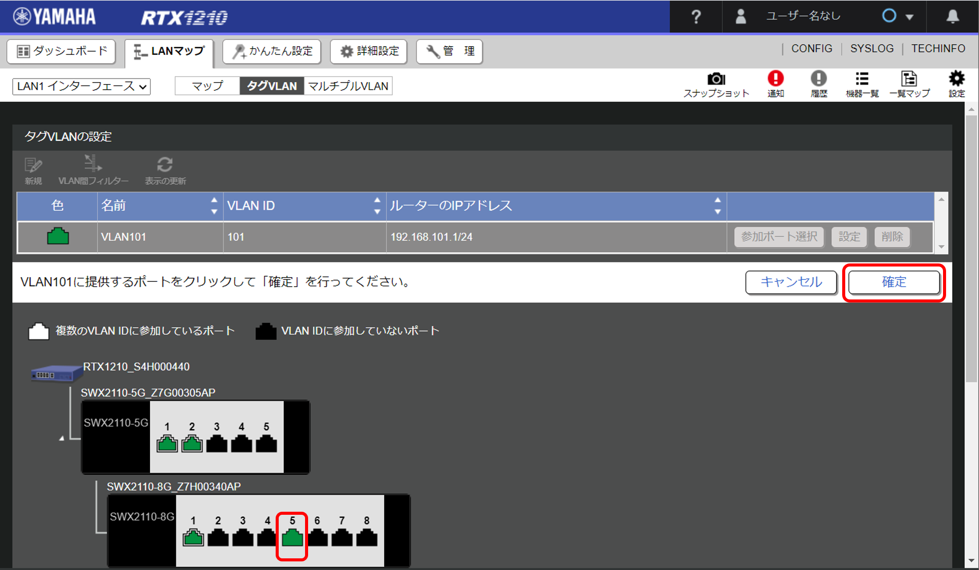 - VLANに参加させたいポートを選択して、 [設定の確定] ボタンをクリックします。