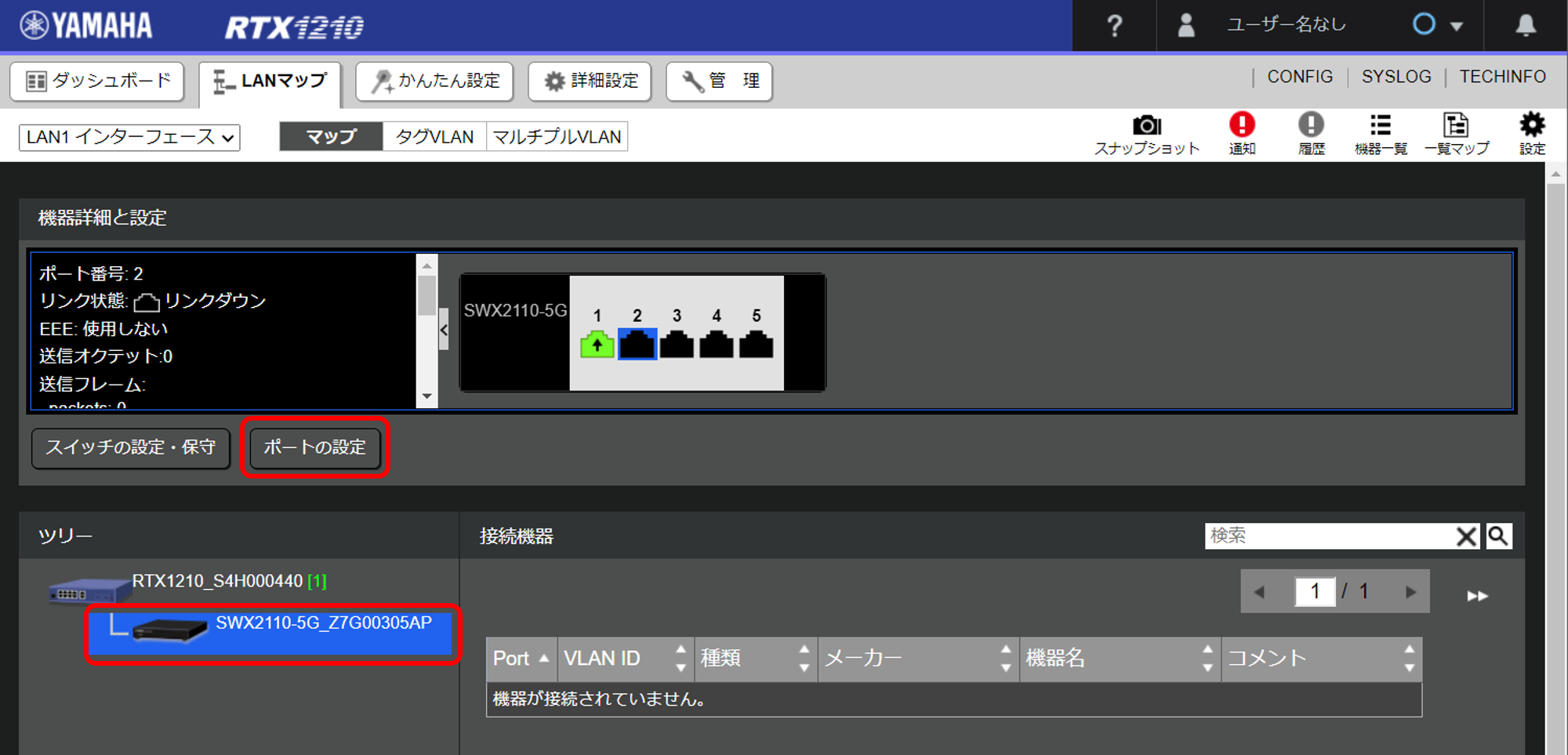 - ツリービューで本製品を選択し、設定対象のポートを選択した後、 [ポートの設定] ボタンをクリックします。