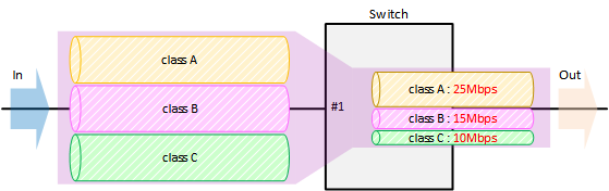 | ポリシング | 帯域クラスの情報を用いて、フレームを破棄することで、帯域使用量を一定量に抑止します。 |