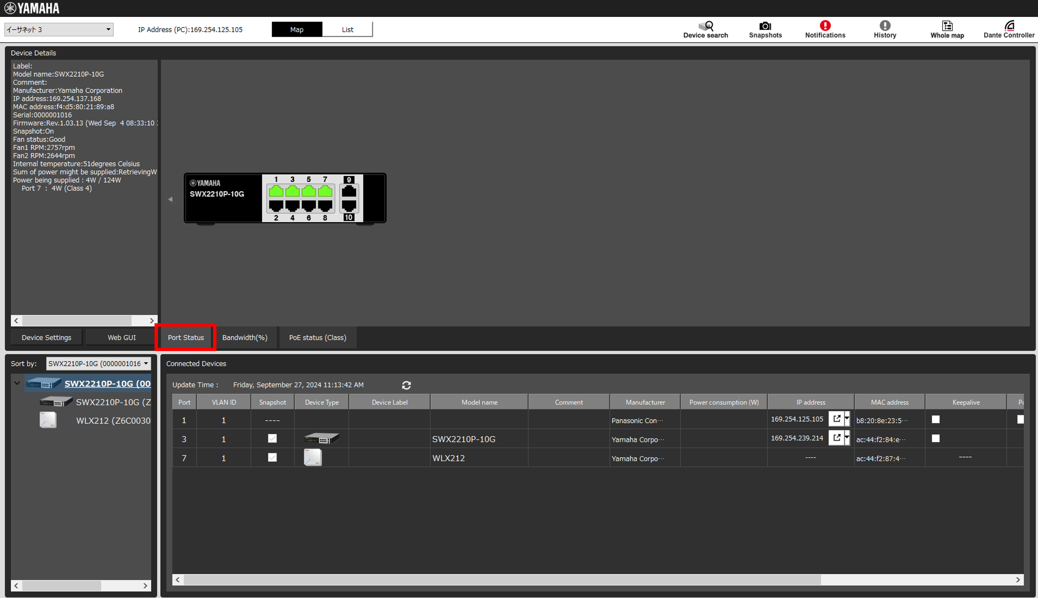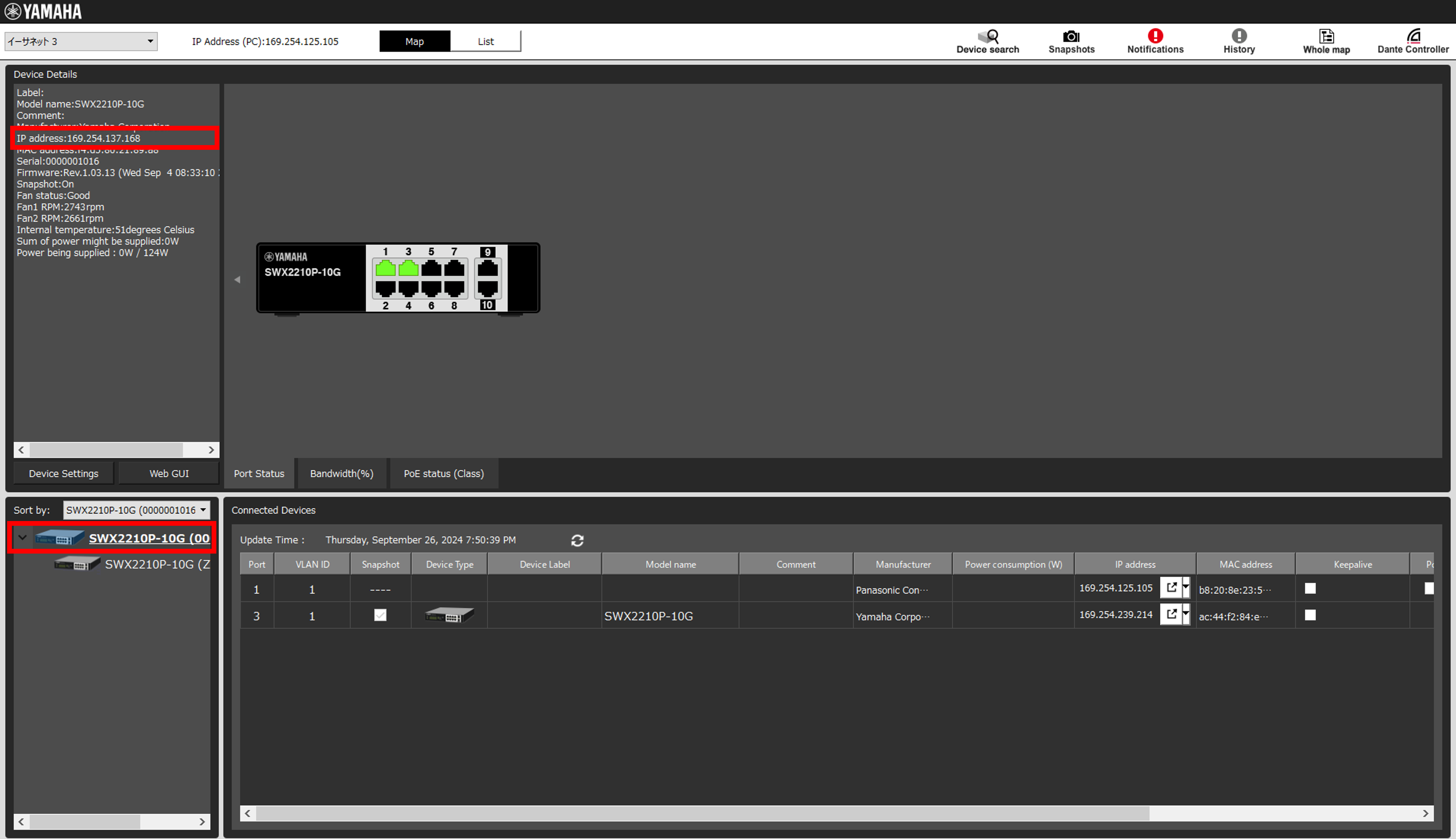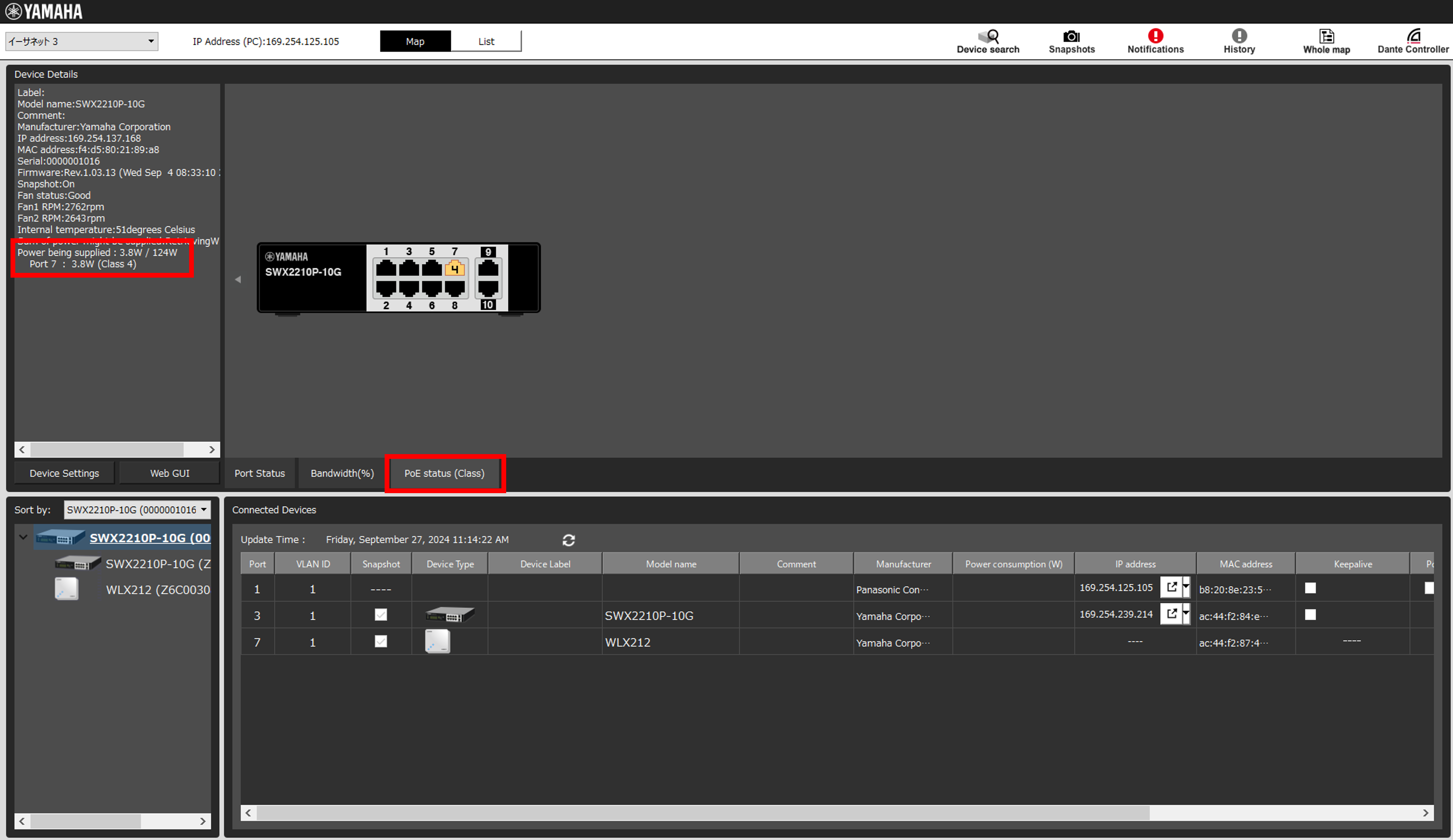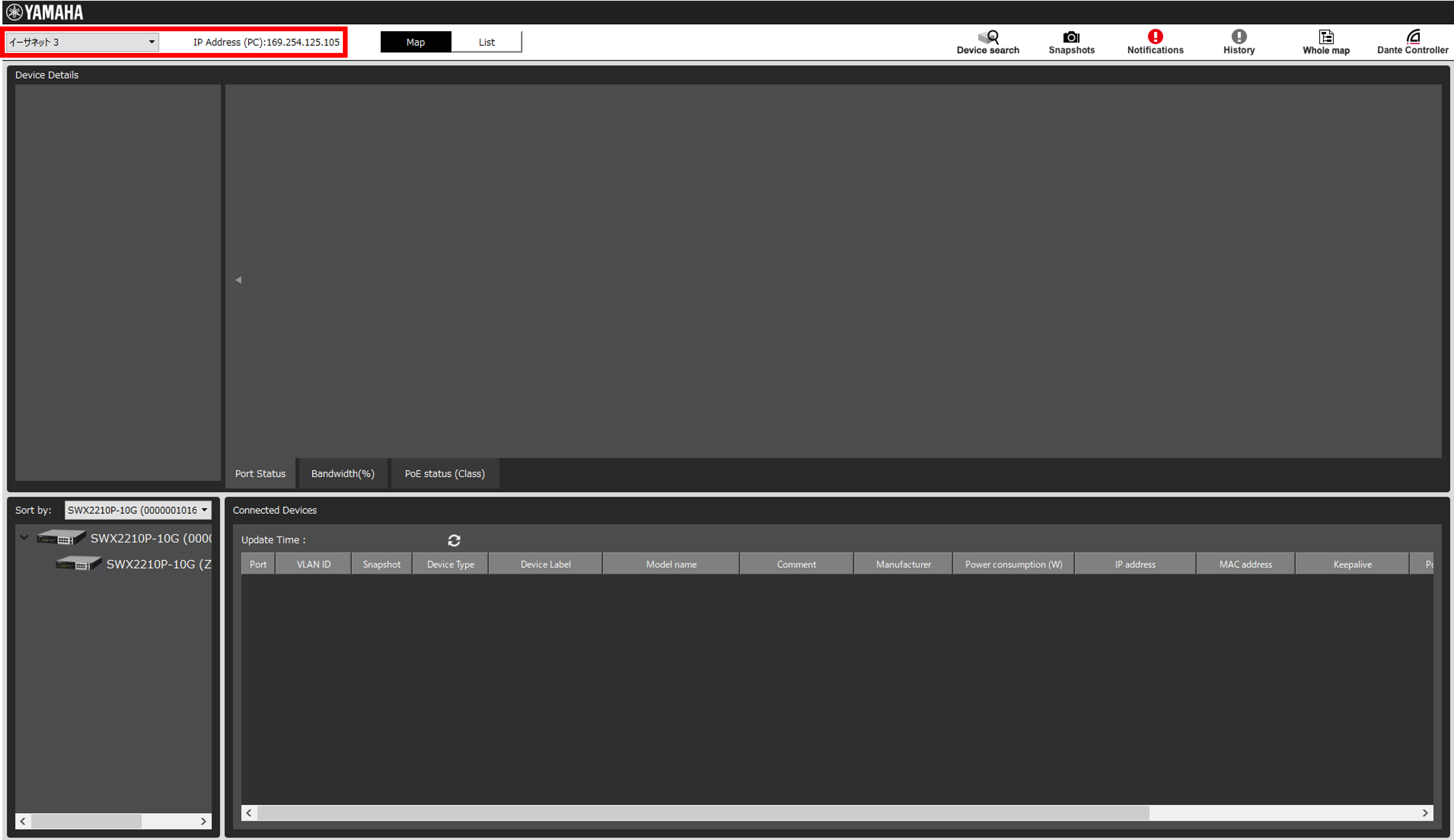 Yamaha LAN Monitorを使用することで、ネットワーク全体の接続構成を見える化することができ、さらにトラフィックの帯域使用状況や、PoE給電状況を確認することができます。