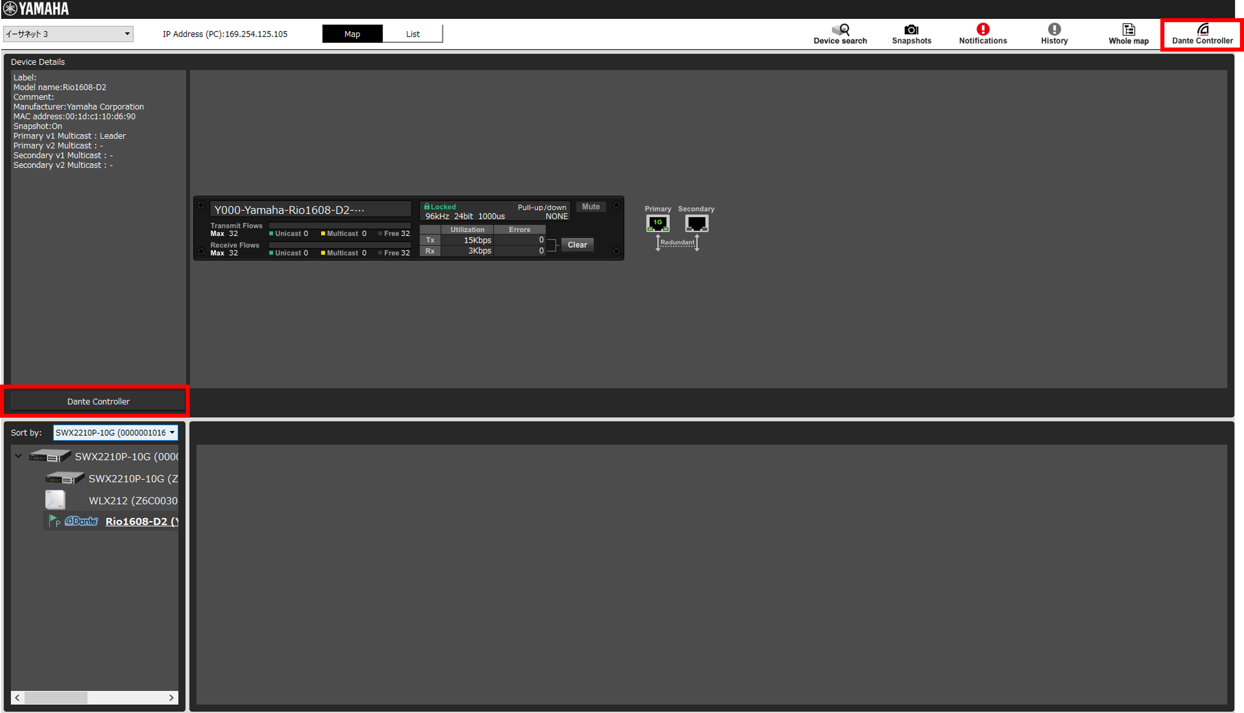 Yamaha LAN Monitorでは、Dante機器の状態を確認したり、Dante ControllerがPCにインストールされていればワンクリックでDante Controllerを開くことができます。