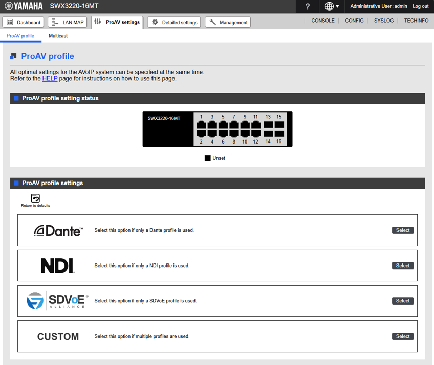 Web GUI「ProAV設定」ページから、DanteやNDIなどの音声・映像トラフィックを伝送するAVoIPネットワークに最適な設定を、簡単なGUI操作で一括で行うことができます。