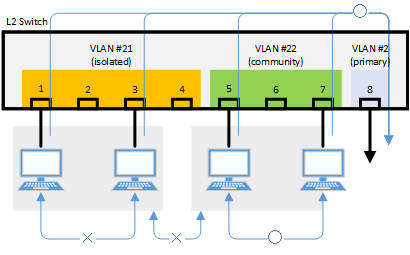本製品は、同一サブネット内でさらに通信可能なグループを分割する プライベートVLAN を構成できます。