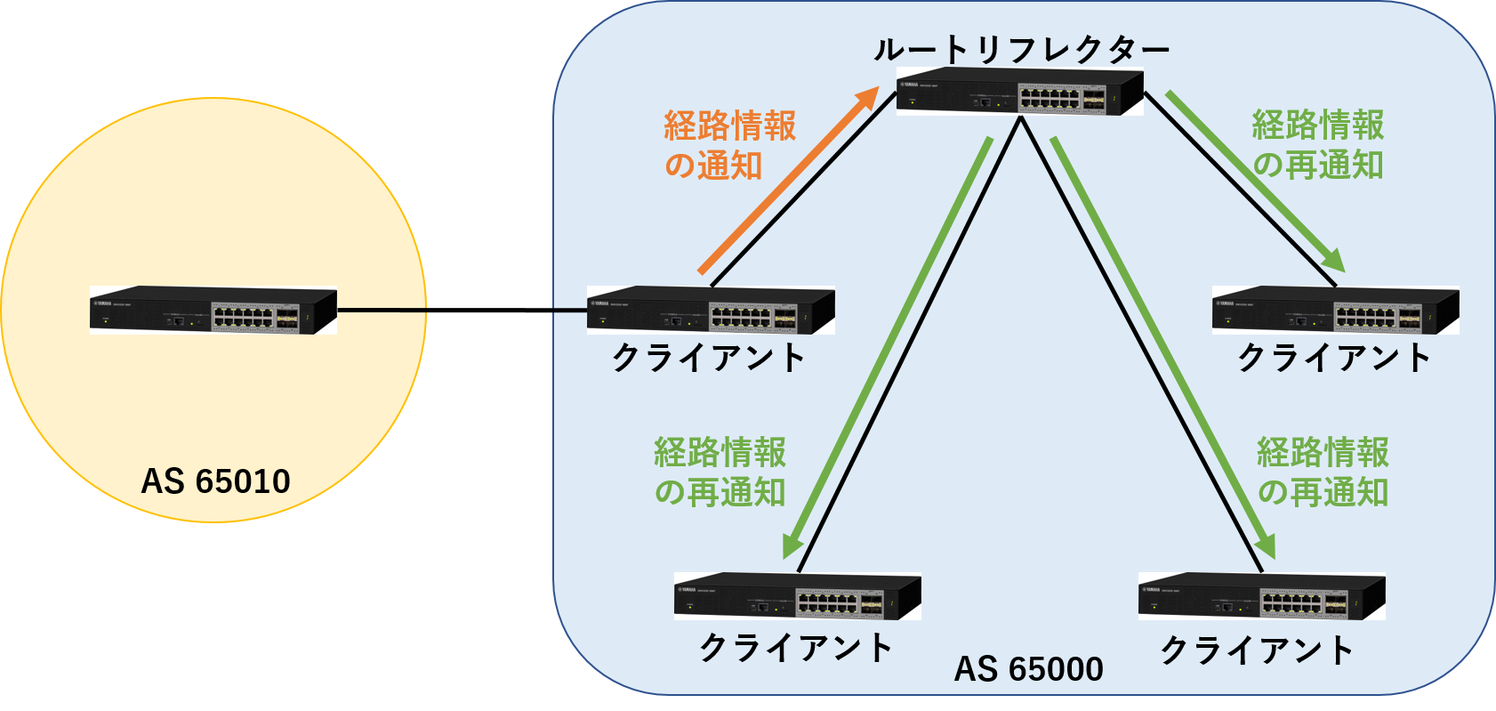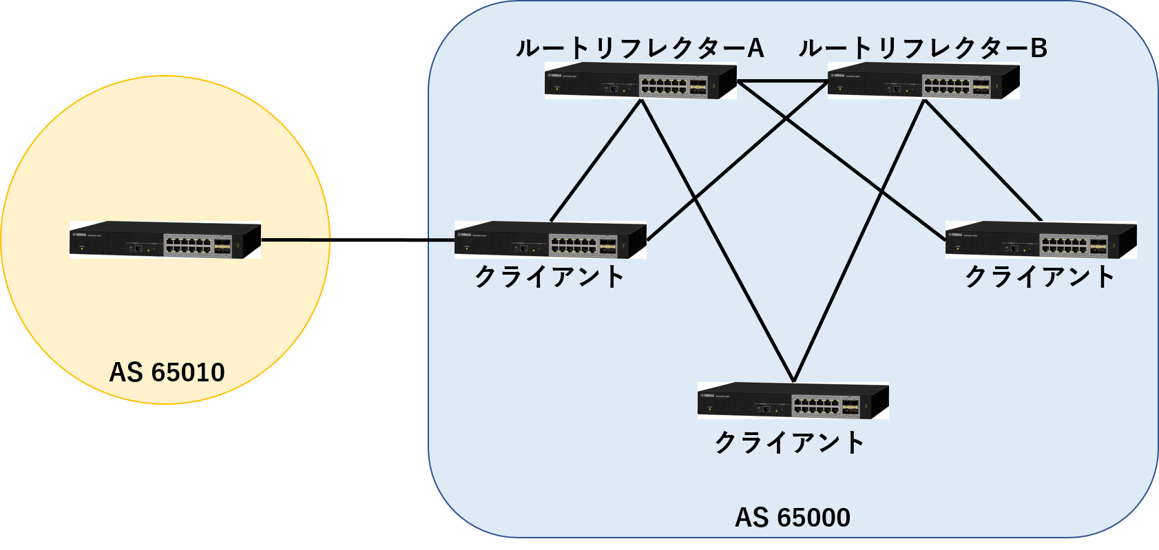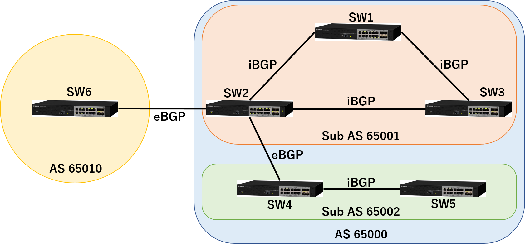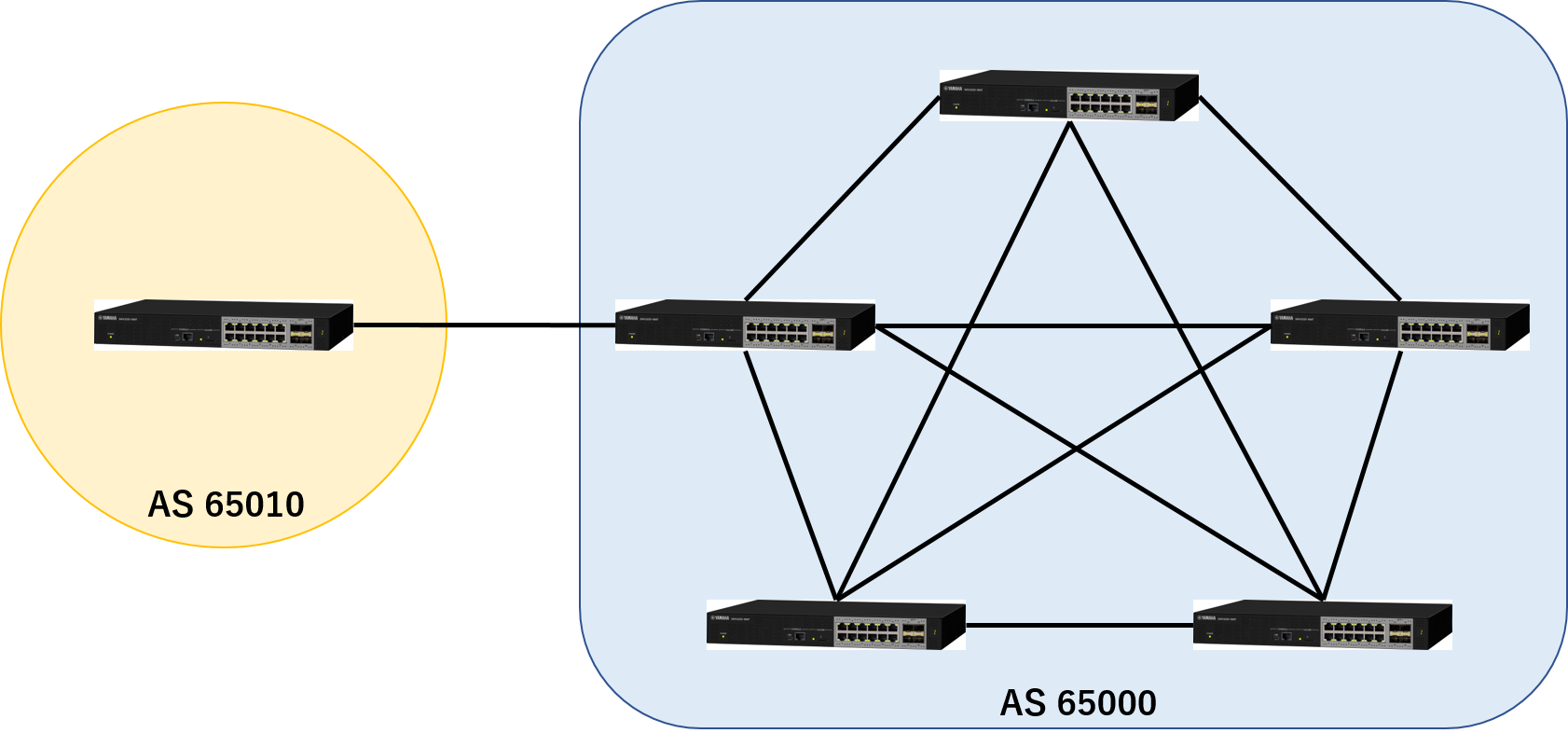 BGPが動作する機器間の接続において、同じASに所属する機器間の接続を iBGP 、異なるASに所属する機器間の接続を eBGP と呼びます。