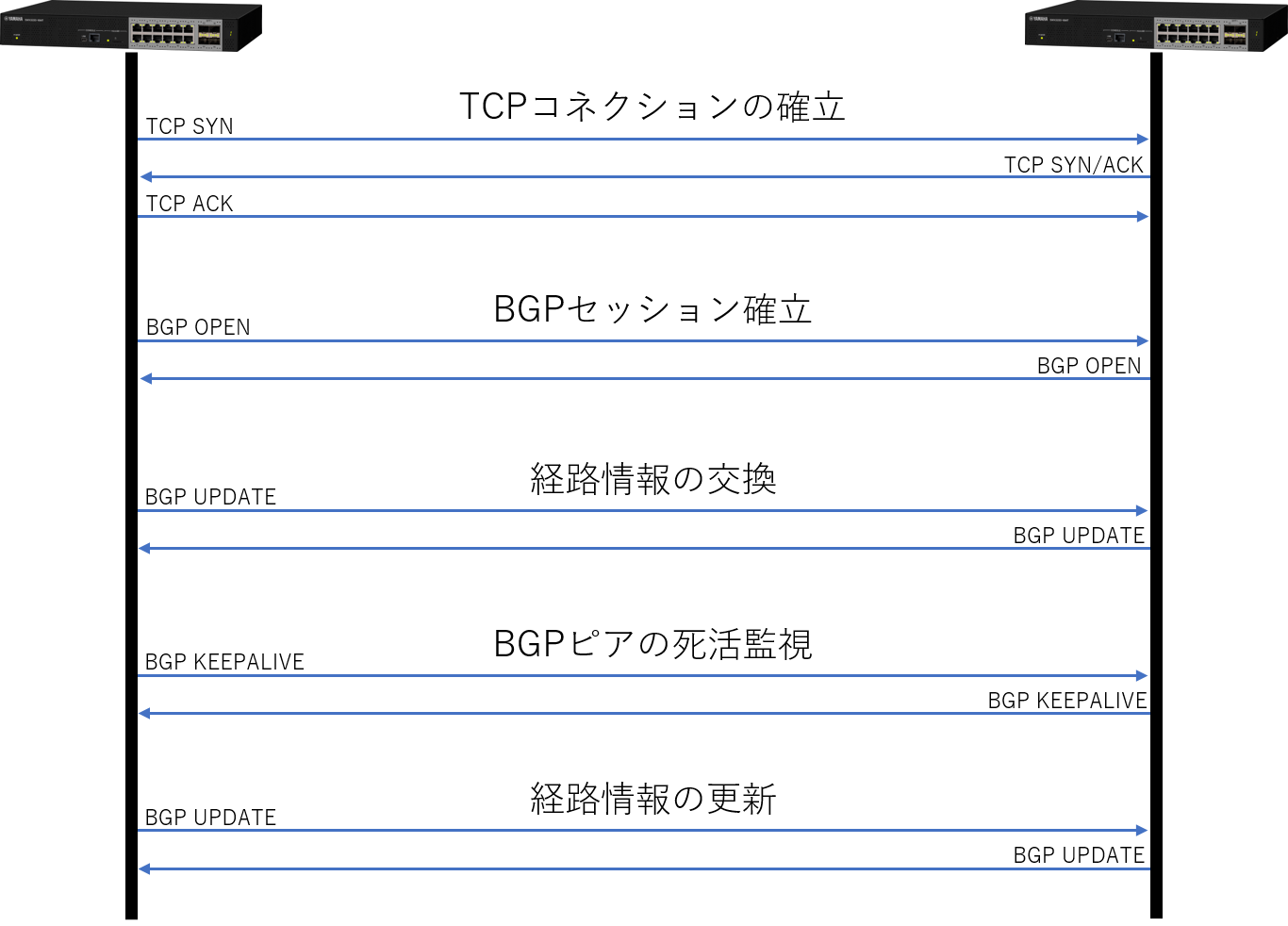 BGPのセッション確立から経路交換までの流れは以下のようになります。